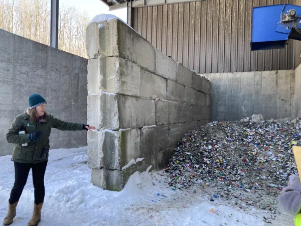 “This is what our glass looks like before it goes to … Ohio, gets cleaned up, and then gets made as a feedstock for fiberglass production in Michigan,” says Lindsey Walker, showing a tour group around the facility.