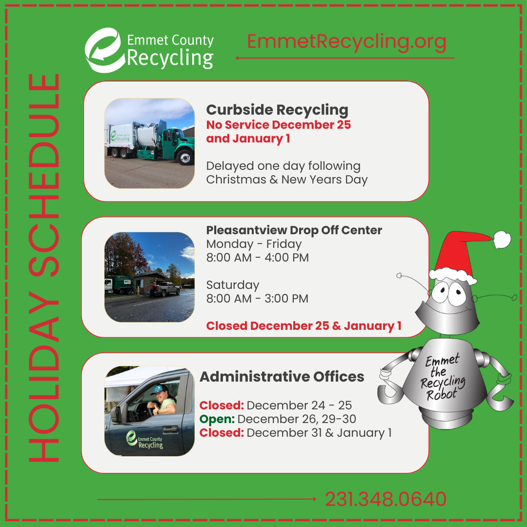 Emmet County Recycling (a division of the Emmet County Department of Public Works) operates the curbside recycling program. We’re the same people who operate the County’s Drop-Off Recycling Sites and the Drop-off Center, which includes a Compost Center and Waste Transfer Station.