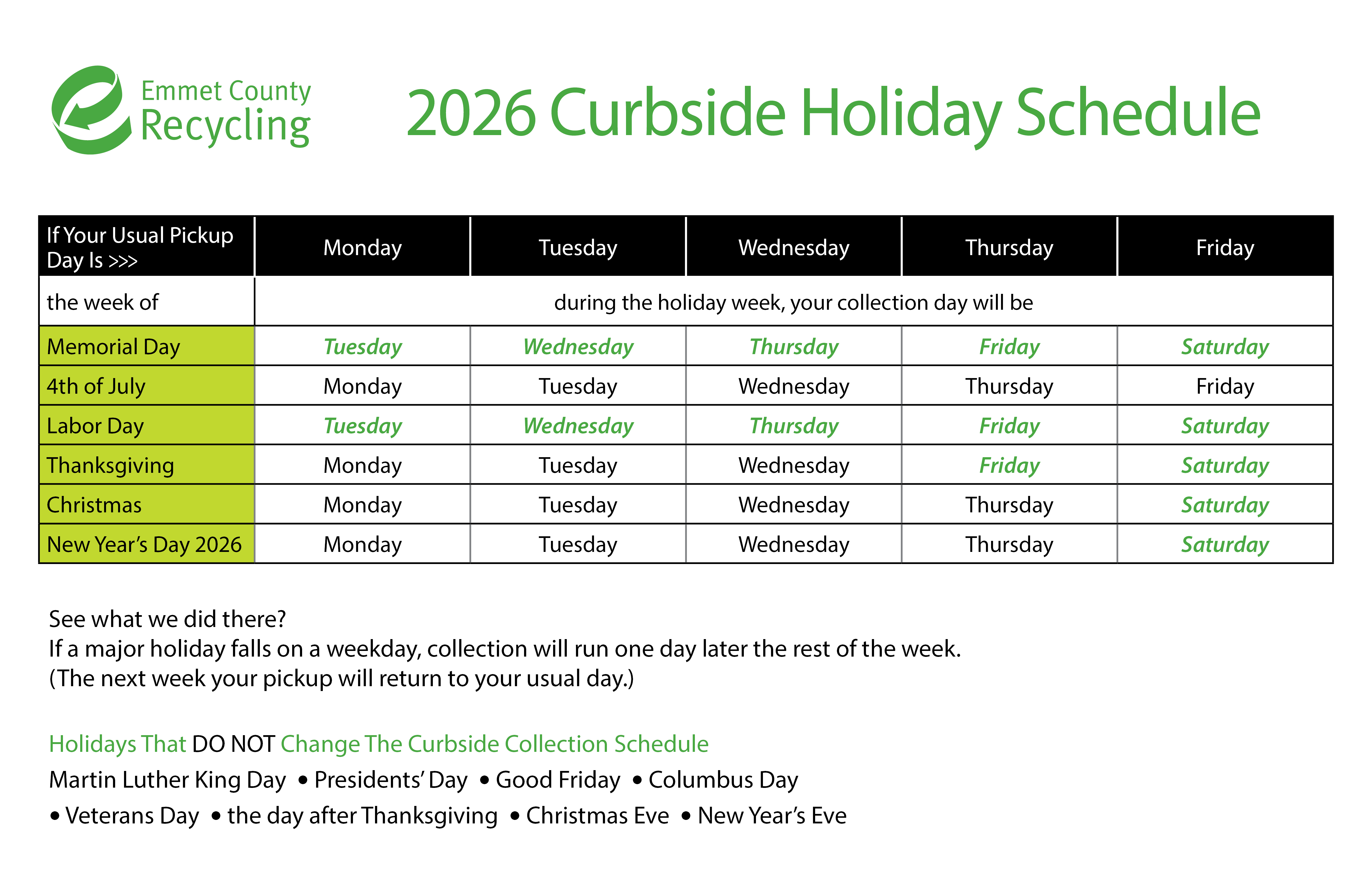When a holiday falls on a weekday, recycling pick up will be one day later than usual for the remainder of the week, with Friday customers served on Saturday. This will always be the case with Memorial Day, Labor Day and Thanksgiving. It will apply to New Year’s Day, Independence Day and Christmas Day in years when they fall on a weekday. The County does not observe any other holidays (i.e. Martin Luther King Jr. Day, Presidents Day, Veterans Day).